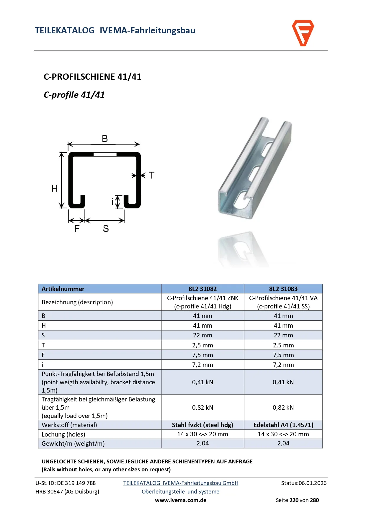 Ungelochte Schienen sowie jegliche andere Maße auf Anfrage.